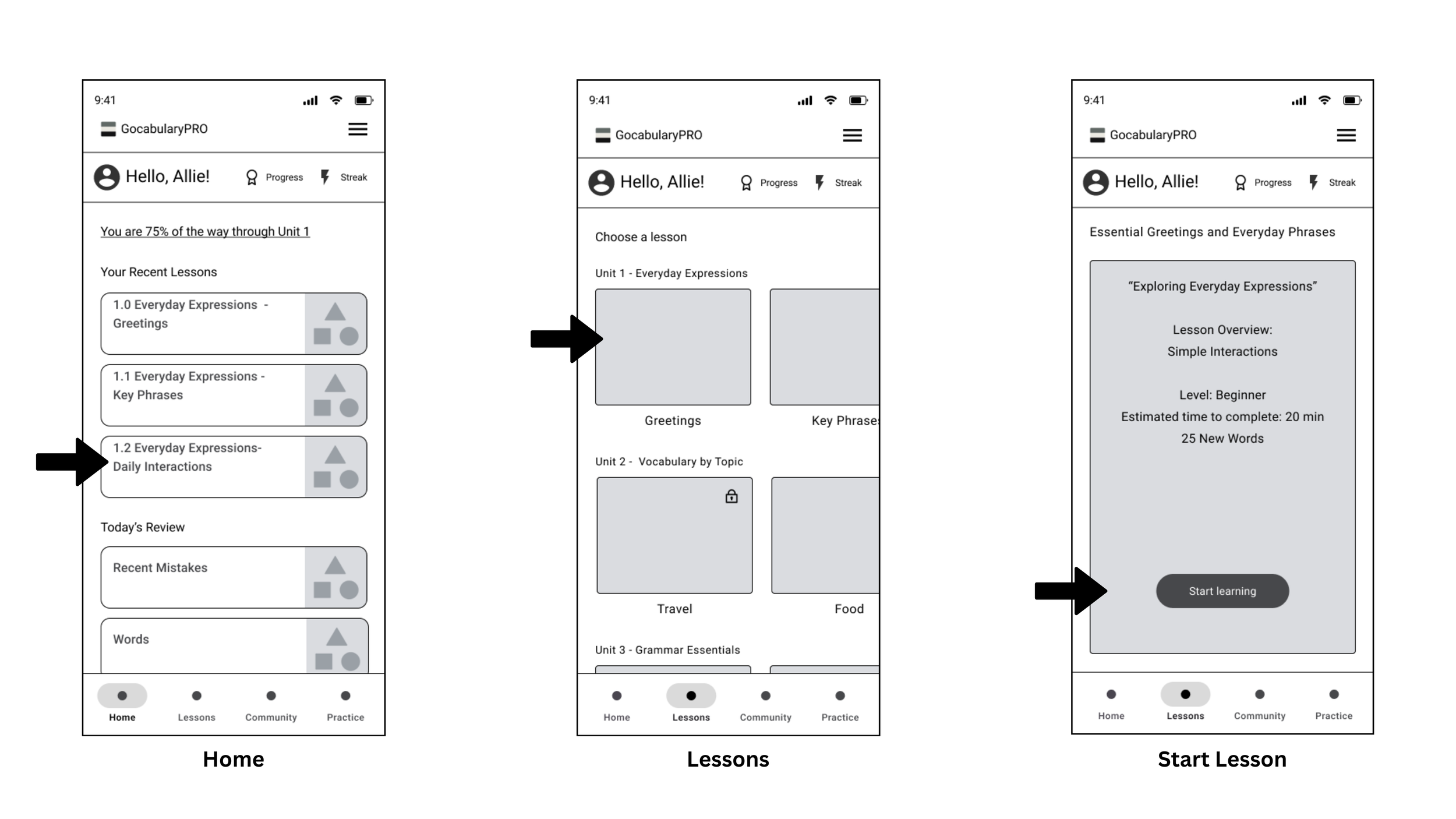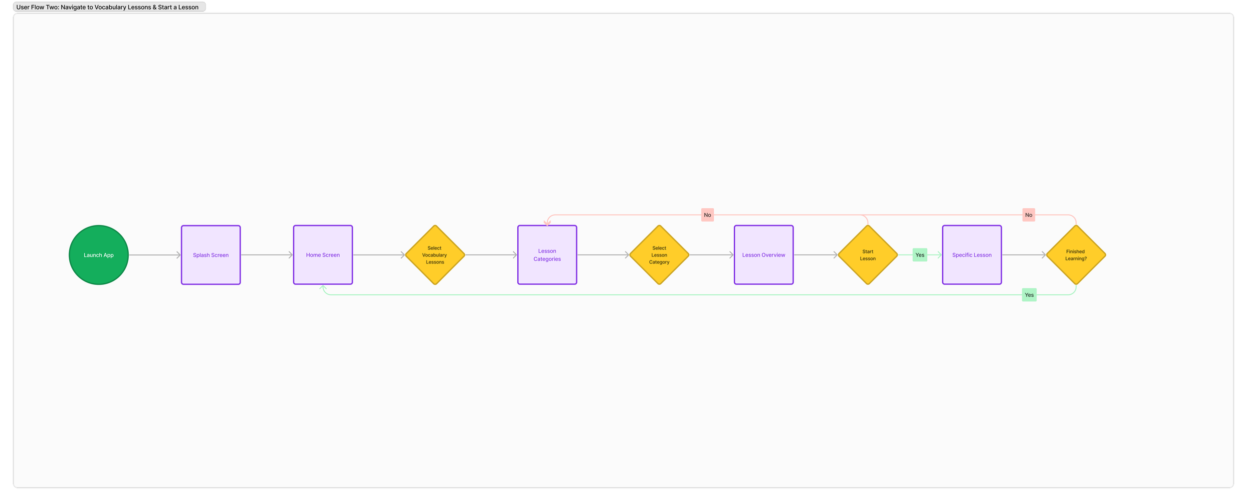 User Flow Two: Navigate to Vocabulary Lessons & Start a Lesson