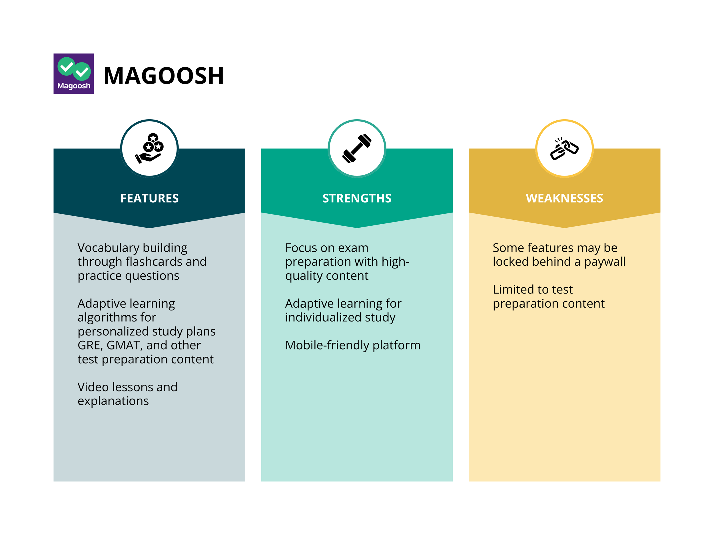 Each app excels in different areas, such as test preparation (Magoosh) and language learning (Memrise), catering to specific user needs.