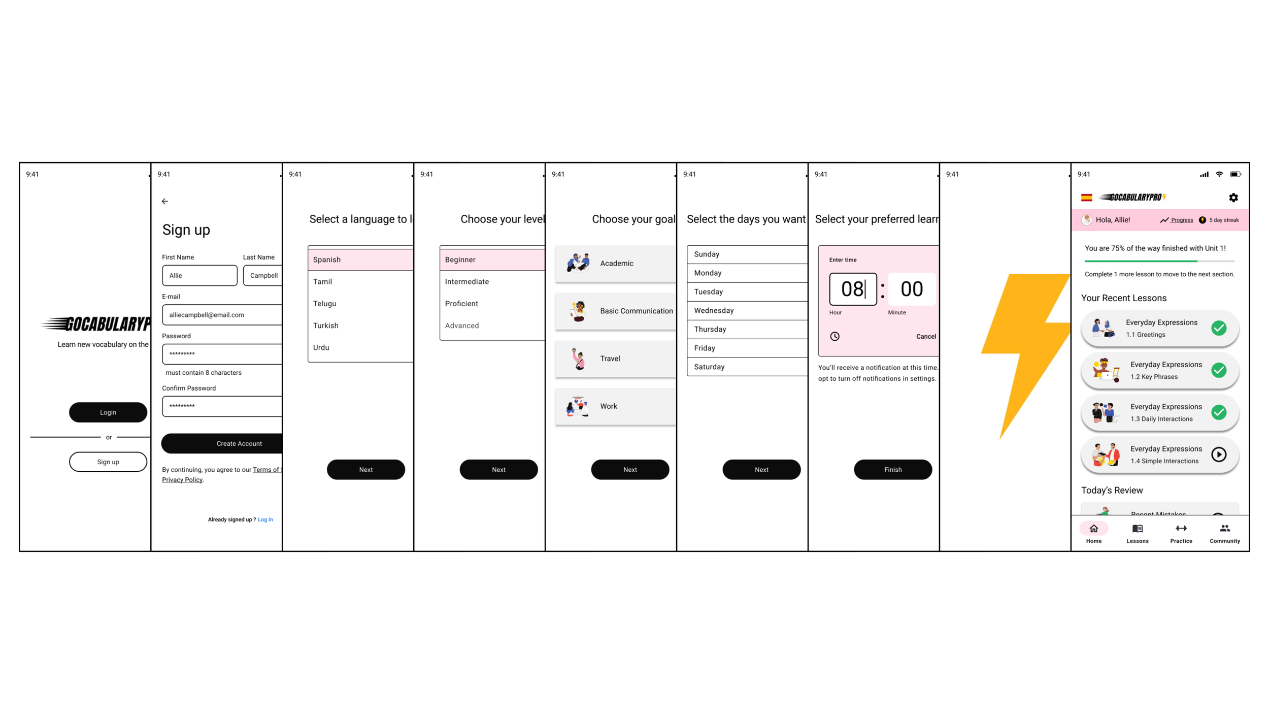 Mid-Fidelity Wireframes were created in order to refine the layout of the app, as well as for the creation of an interactive prototype that could be presented in usability testing to test some of the user flows for the GocabularyPRO app.