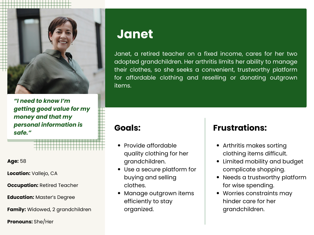 Janet, a retired teacher with arthritis, needs a secure, easy-to-use platform to manage her grandchildren’s clothing due to her physical limitations and fixed income.