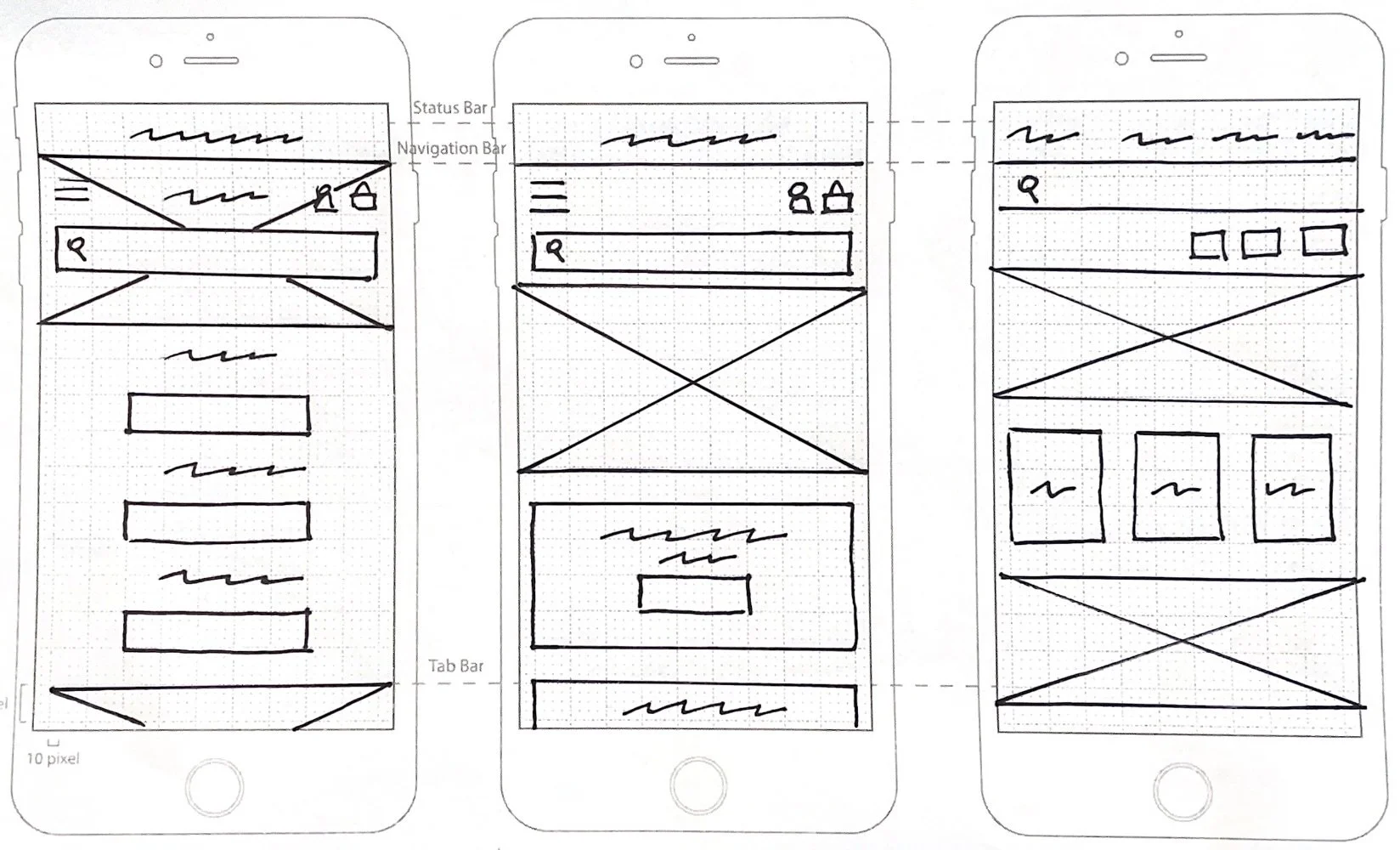Paper wireframes focused on on the core features identified during user research. The first wireframes were created using pen and paper.