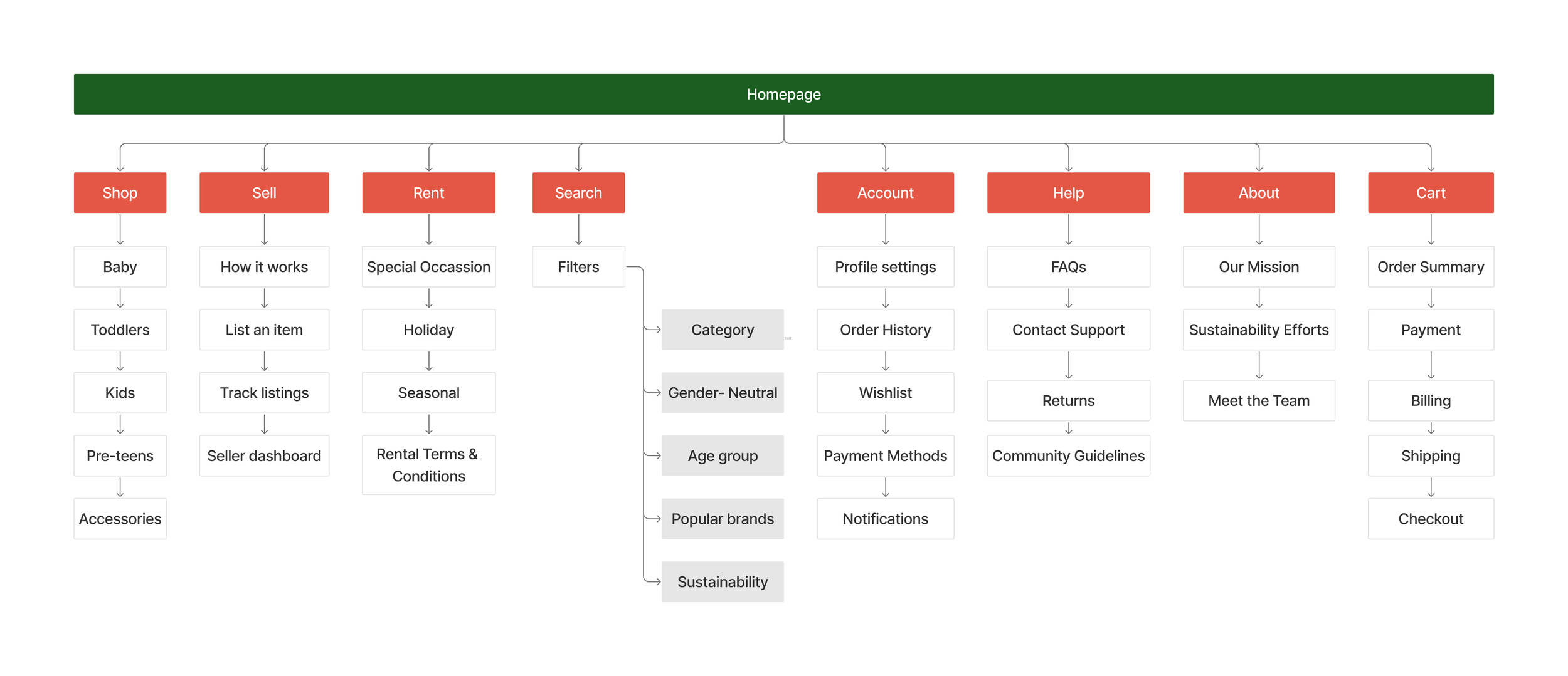 By organizing everything into clear categories and creating direct paths to key features, the sitemap reflects the platform’s goal of being efficient, user-friendly, and aligned with sustainable practices.