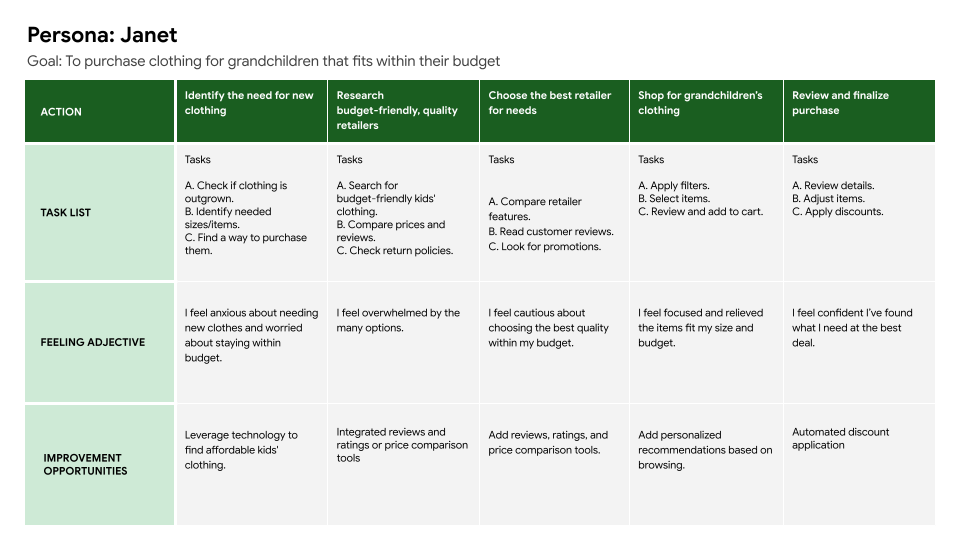 User journey maps were created to illustrate the processes that users like Janet might go through while trying to accomplish their goals, including how they might behave, feel, and their thoughts while completing goal related tasks. The goal of these user journey maps was to address pain points or take note of any moments of enjoyment.